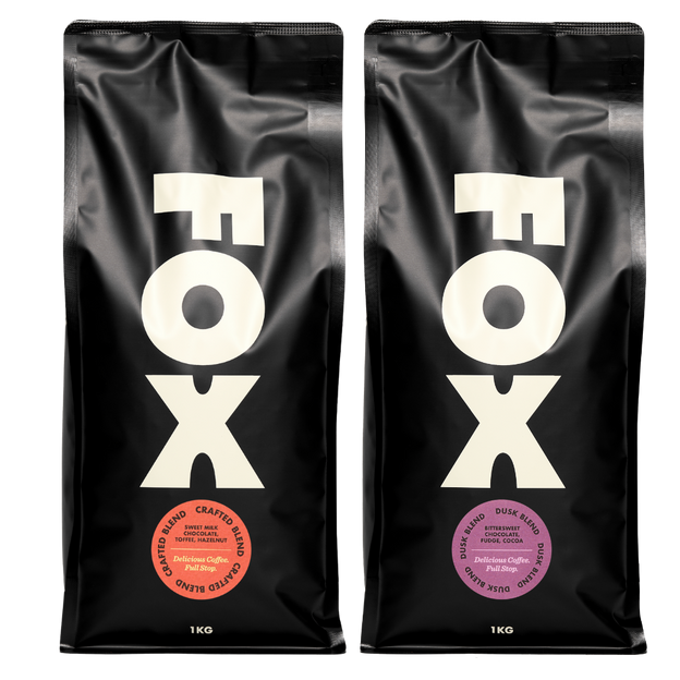 Crafted is classic Fox—chocolate, nuts and sweetness with zero bitterness. Dusk is classic Fox turned up a notch—thick chocolate, cocoa and fudge. No sour, funky science project stuff here. Just two reliable, full-flavoured blends you can serve to anyone.